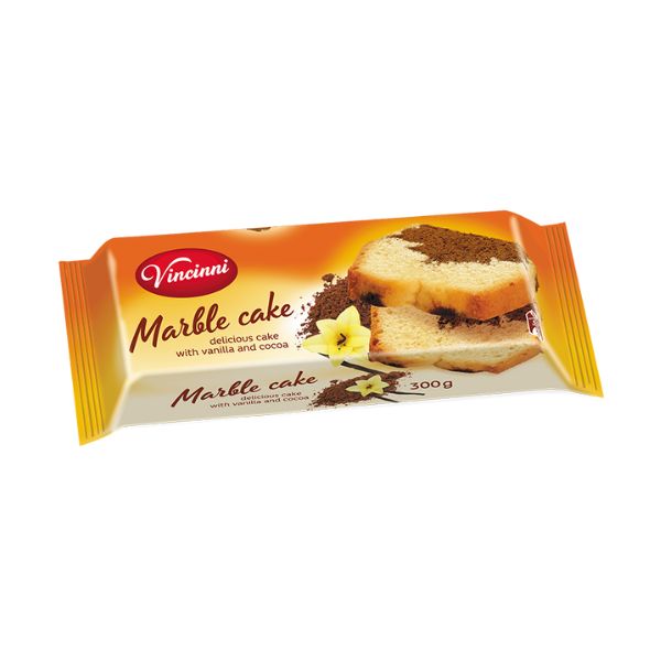 Το Vincinni Κέικ Μαρμπρέ 300g είναι ένα αφράτο κέικ με γεύση βανίλια και κακάο, γνωστό και ως κέικ ανάμικτο. Η χαρακτηριστική του εμφάνιση με τα στροβιλισμένα σχέδια βανίλιας και κακάο το καθιστά ιδανικό συνοδευτικό για τον καφέ ή το τσάι σας.